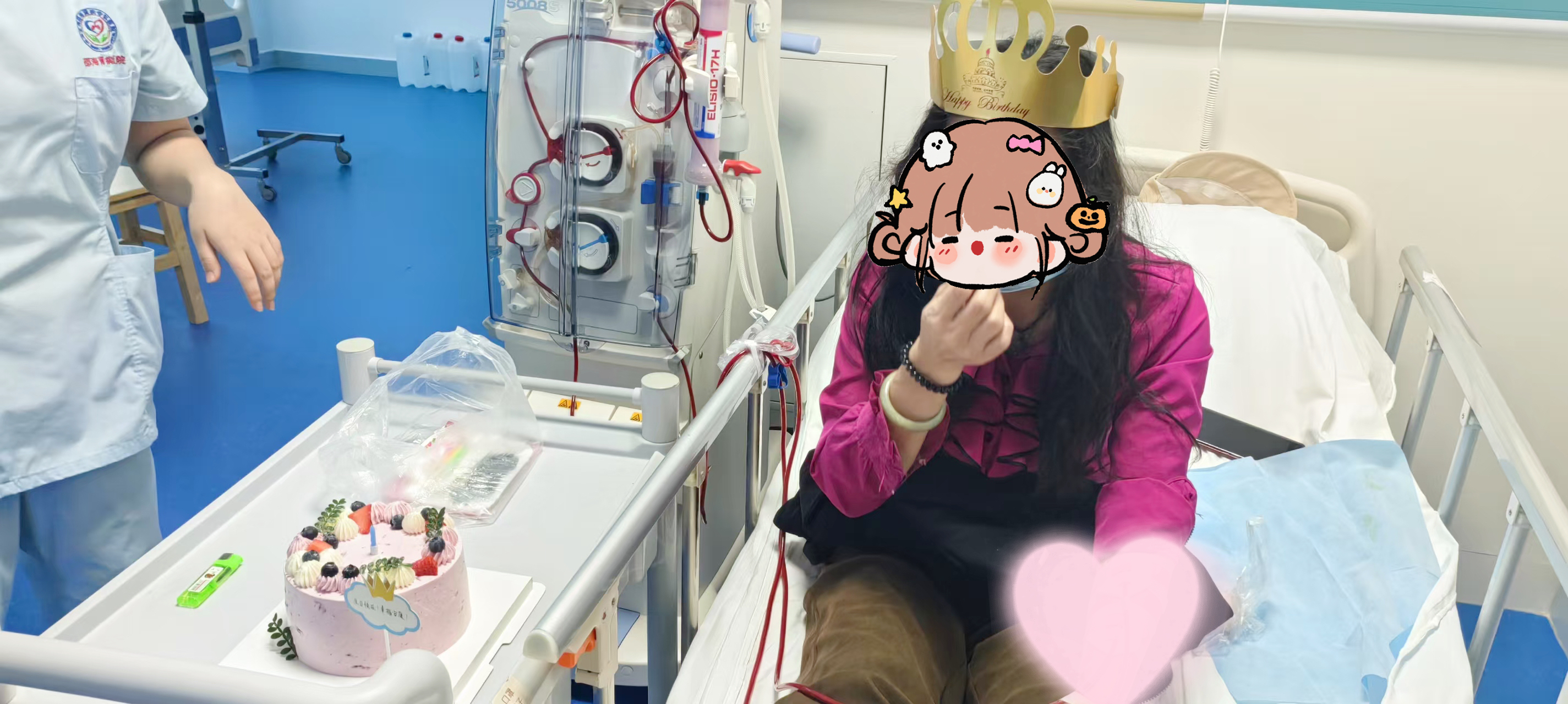 2025年3月28日是我院腎友沈姨的生日,沈姨是中班做血液透析治療,中午時(shí)分她就來(lái)到了醫(yī)院,準(zhǔn)備上機(jī)接受透析治療,我院醫(yī)護(hù)人員決定給沈姨慶祝生日,我們給沈姨訂了一份精美的生日蛋糕禮物,希望能給沈姨一份驚喜,給她帶去開(kāi)心快樂(lè)。